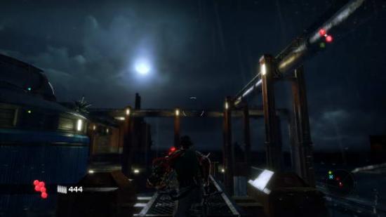 第一招就是身体闪红光,大约一秒后会向主角冲过来,这个只要按默认的CTRL(当然要同时按左或者右)或者跳开就可以顺利回避了,只要没有中到BOSS的攻击(如果我们中了这招,BOSS的背后是不会打开的,我们的攻击对它没用的),他的背后就会打开(白色的),只要瞄准白色那里按鼠标右键伸出钢绳(中了就要按住鼠标右键)然后在加上SPACE,就会踢到BOSS,BOSS才会扣血的。