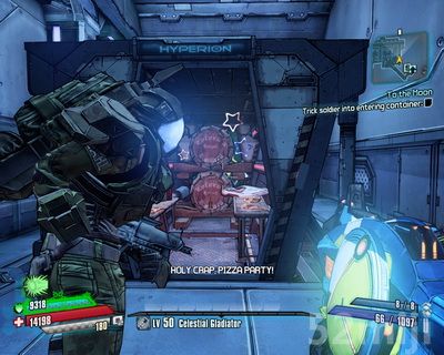回Jack's Office(杰克的办公室)继续前面任务,完成进程后回上一场景,激活“Voice Over”(对话结束)任务,到达北区。顺便可以完成Hot Head(头脑发热)任务。这两个任务都完成后请切换回“Paint Job”(喷漆工作)任务摘取鲜花并继续完成这个任务,之后可接“Kill Meg”任务(有!),按地图指示去到任务点后先别按开启垃圾房的开关,切换至“Boarding Party”任务,拾取第一个ECHO(Athena)!然后切换回之前任务,杀掉怪物后回Jack's Office(杰克的办公室)交已完成的任务,然后传送回Hyperion Hub of Heroism(亥伯龙英雄殿、英雄中心)切换回“Boarding Party”击落显示屏,拾取第二个ECHO(Nisha),继续任务。在拾取小吵闹的ECHO时顺便接“Cleanliness Uprising”任务。在去捕捉第二个清洁机器人的附近切换回“Boarding Party”,打开水道的暗门并拾取最后一个ECHO(Wilhelm)!