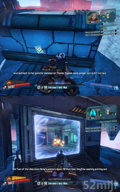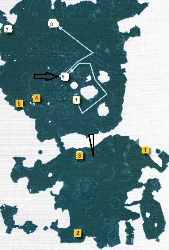 在这之后切换回“Recruitment Drive”(募集驾驶)任务,记得驾驶飞碟!这样时间会充裕很多!按下图指示到达张贴海报的地方并通过击毁火焰桶引燃敌对阵营的海报,除了在2、3、5、1这几个地方需要下飞碟互动外,其他的都能在驾驶同时完成的,从5处能跳跃到6处省去路程!同样的在传送点外面的悬崖也是可以飞过去南区而不用通过大桥以节省时间!(图示向下的黑色箭头)