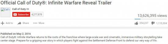 而今年的另一款大作《使命召唤13:无限战争》(Call of Duty: Infinite Warfare)的官方预告片在youtube上发布超过6天时间不满意人数已经超过100多万,点赞只有25万,几乎是一边倒的差评。