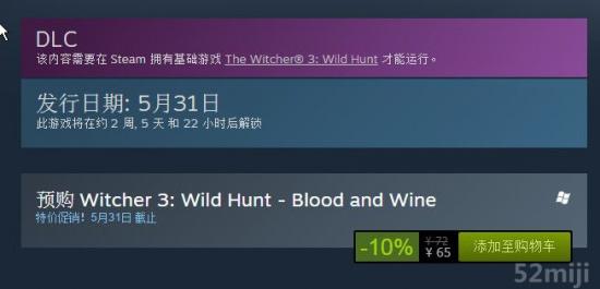 与此同时,Steam商店也正式上架了血与酒,并对预购用户打9折,售价65元人民币。