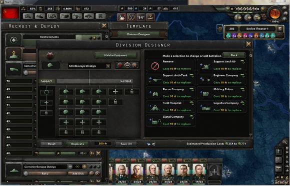 在科技树内的第二个面板里有一个全新的支援单位列表。在师编制界面里可以看到最左侧的support列,是唯一的,单独的,不能放步兵的特殊列表。