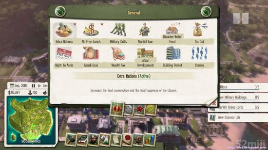 所以说殖民时代我们确立的大方针就是积极听从上级领导指示,坚决贯彻中央政策部署~但是由于和保守派的关系很难搞好,必须要建造一些军事建筑来转化独立派,一方面也是为了武装起义做准备~然后等支持度上升到40%左右就可以发布extra ration,no free lunch和tax cut(如下图所示),支持度就能飙升到50左右了~