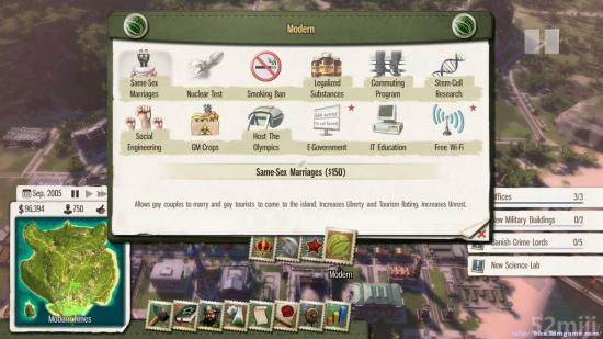 摩登时代的法案也还不错。。wifi可以点增加住房和旅游,E-gov可以点降低法令费用~至于同性恋结婚神马的就看你自己了·
