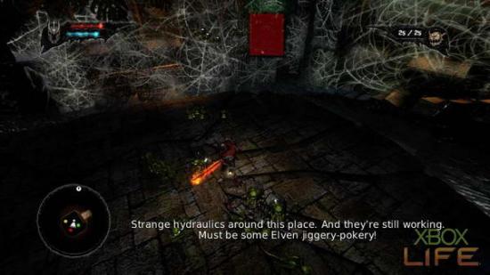 来到城镇大门前,只须利用右侧的蜘蛛网爬上牆壁,触动二个开关后便能开啓大门。