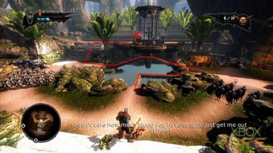 一路杀到雷达所标示的位置,便会触发剧情动画。听了那位肥王废话一大堆,最还是得把她除掉,才能控制这个人间天堂。控制权回到玩家手上后,先命令所有小鬼沿著独木桥行走(图片红色路线标示),先解决掉军队队长,这样才能把靠近魔王的军队杀掉。