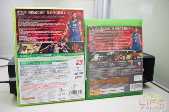 Xbox 360 与 Xbox One 版游戏盒对照,同样都由奥克拉荷马雷霆队当家球星凯文杜兰特担任封面人物!