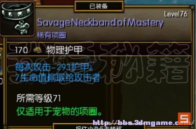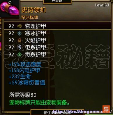 宠物的装备视频中大家可以看到,选择的是破盾机率100%的蓝装和每击减全防的蓝项圈