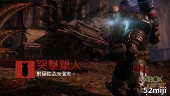 在教学关卡中玩家扮演的是突袭猎人 Markov,配备能够稳定输出火力的突击步枪、威力强大的区域伤害武器闪电枪、电磁地雷以及个人护盾系统。身为团队火力输出者的突袭猎人,Markov 的闪电枪可以造成区域内的大规模伤害,不论是对付野生动物或者是怪物都相当有效,但需要注意枪械的过热问题。突击步枪虽然威力没有闪电枪那麽可观,但可以从远距离就输出伤害,两把武器交换使用可以造成怪兽极大的压力。电磁地雷则是可以佈署在固定区域内,当怪兽或者野生动物经过时造成可观的伤害,而个人护盾系统则是启动后可以获得短暂时间的无敌护盾。这样的特性让 Markov 不仅有可怕的火力、同时也有一定程度的自保能力以及利用地雷在特殊地形中发挥额外伤害的可能性。