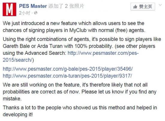 其实沿着这个思路,大家可以参考抽出其他黑球球员的。因为今年pes出了一个数据库叫Pes Master,可以通过限制选项筛选球员。如果特定的条件组合可以筛选出较少较好的球员,大家就可以专注这个条件的免费经纪人抽取。Pes Master现在新增了球员抽取概率的显示,大家可以参考。