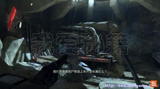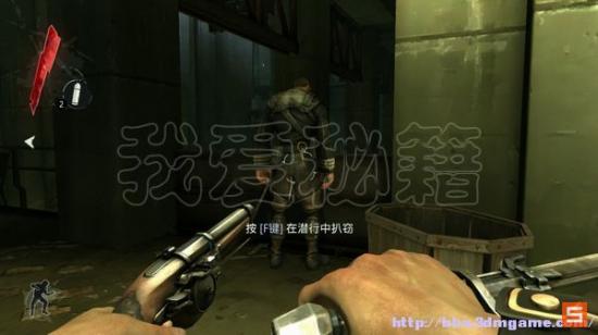阅读补给箱上的字条,从箱子里拿到下水道钥匙和驽枪。驽枪发射的噪音低,精确度也高于手枪,是常用的武器。只是箭支的来源较少,每次回到狗圈酒馆的时候,记得将弹药补满。这里熟悉下技能轮,按鼠标中键打开它,选择装备的武器或能力,或者将武器或能力分配到快捷栏里,按相应的数字热键来切换。