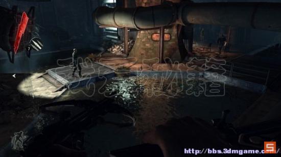 来到控制室区域,这里共有三名守卫,等前面的两名对话后分开,溜进左侧的房间解决掉一名,再处理走廊上行走的。另一种解决方案,先清掉走廊上的,利用墙边的架子爬到红色的管道上面,当守卫经过的时候跳下去施展下落刺杀。透过锁孔观察隔壁控制室的动静,击倒里面的守卫,操作控制台的拉杆打开铁门。