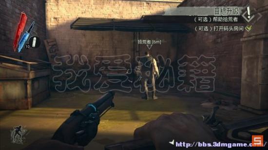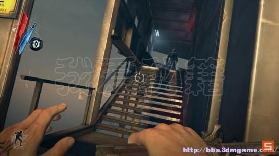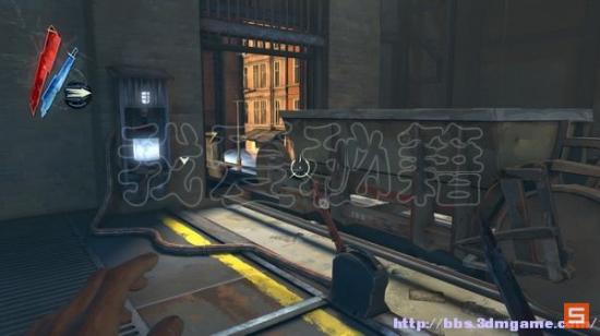 来到大桥北部区域,先跃进左侧的废屋里,往上跳两层,沿管道阳台进屋,由屋子另一侧的窗户跳上管道,回身射毁上层的窗户栅条,纵身跃进去拿骸骨护符(3/3)。在前面还有一幢废屋,底层是座牢房,潜到左侧拆掉鲸油罐解除屏障封锁,里面的囚犯会逃跑,引开附近的守卫。趁机纵身攀到上层,移到墙上的油画找到一只保险箱,用密码294打开它。