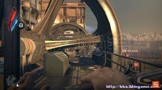 进到从桌上拿到符文(4/5),穿出屋子看到街道上有几名守卫,利用雨搭和管道绕到右侧建筑的后面,解决掉倚栏望海的守卫,然后再解决街面上巡逻的两名,上楼梯跟随守卫进控制室,解决最后一名。前面是一道光之壁屏隙,要解除它需要穿越一只旋转的轮子进到院子里拆鲸油罐。旋转的轮子可以用控制室的拉杆停下来,也可以使用时间扭曲能力减缓时间的流逝,钻过去。