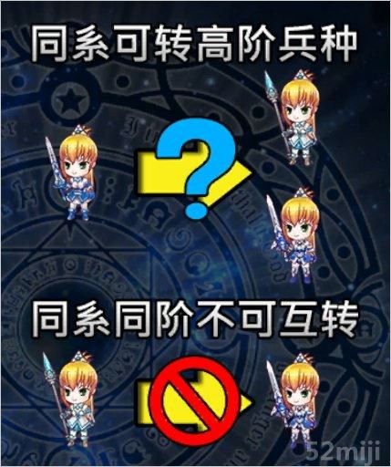 需要注意的是,同系兵种虽然可转职为不同的高阶兵种。但是在转职为高阶兵种后,同系高阶兵种内便无法继续横向的自由改变了,例如在战斗防御系兵种内,一但妮雅从最初的剑士兵种转职为2阶兵种的剑斗士后,则无法再转职为2阶兵种的骑兵了。
