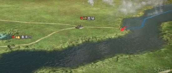 大家可以看到这条路上有一个小河沟,只要有一个军势处在图中箭头位置的路上,两个军势在这里交战,便会发生水战。那么怎么让军势停在这里,点击进军这条路上的某个部落,只要到达这个部落之前,经过这个地方的时候,就点击军势,让军势待机。军势待机的命令在其他选项里面。