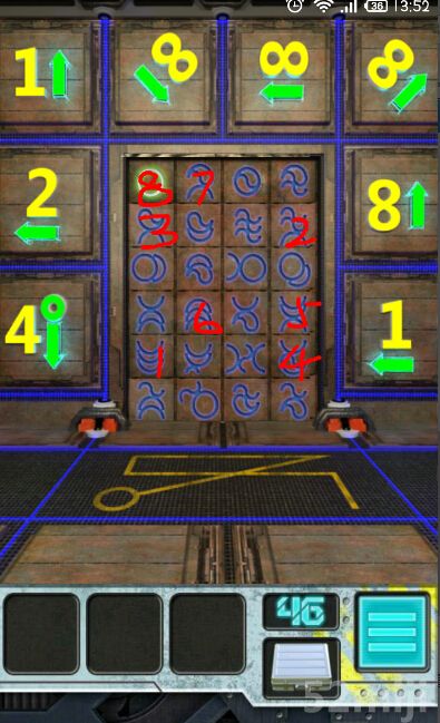 第48关、可以说是瞎糊弄过去的,具体解法,自己多试试就行了。(门顶上的4排数字都显示亮了,即通过)