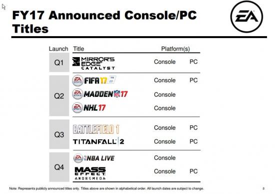 2017年初(财年的Q4)发售的游戏为《质量效应:仙女座》(Mass Effect:Andromeda)和NAB LIVE。