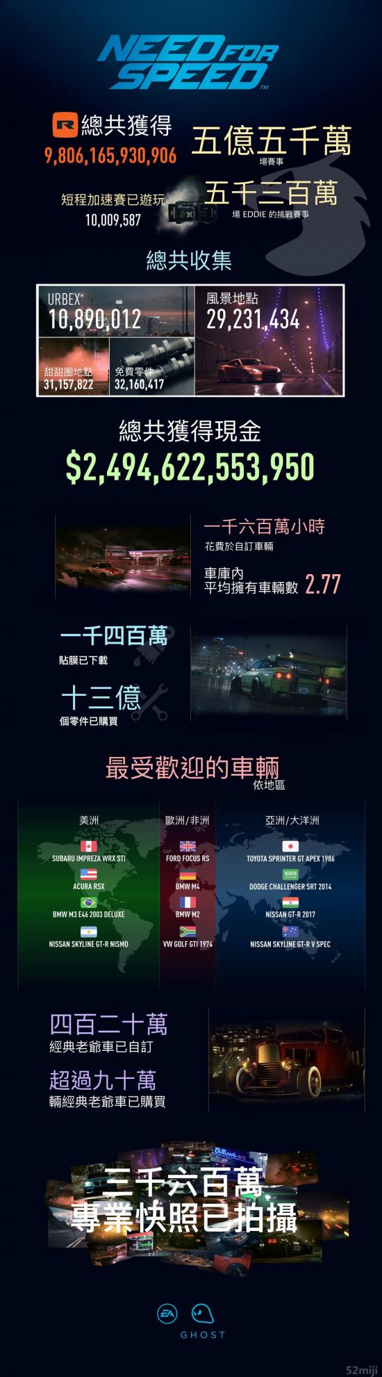 《极品飞车19》重磅回归后, 各位都在文图拉湾的道路上花了大量的时间。 各位蒐集了超过 98 亿点的 REP 积分、拍摄超过 3 千 5 百万张快照、在 1000 万场短程冲刺赛中狂飙,同时完成了总数 5 千 2 百万场的 Eddie's Challenge 赛事。 各位共花了惊人的 9 亿 5 千万分钟改装车辆,同时赚取了 2.5 兆的游戏内货币。 各位分享了超过 700,000 张贴膜,导致其他 NFS 玩家贡献了 1 千 3 百万笔下载数。