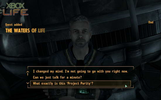 “在你成长的Vault中,有自己的淨水装置。那里从未需要担心缺乏淨水。而在外面,事情并不一样的。在外头的水,不乾淨,还有辐射污染。这样的水很难维系生命。如果我们能改变这一点,就有机会重建人类社会,让一切从头来过。