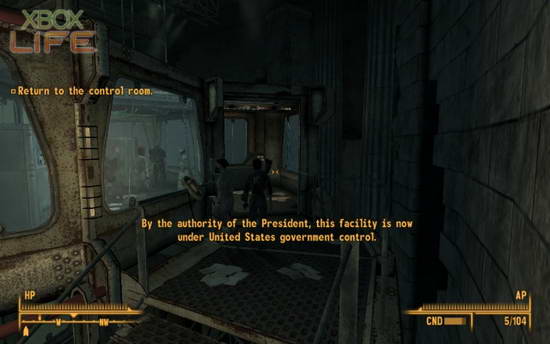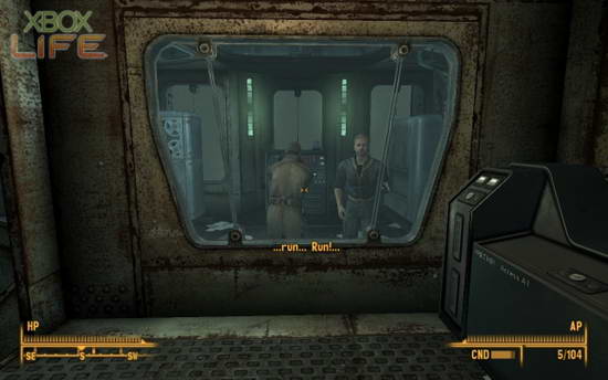 回到圆形大厅,我赶紧跑上主控室—而主控房已经被封锁。老爸跟几个人在里面,有个穿军大衣的家伙似乎掌握了局势,两名Enclave士兵持枪在旁戒备。Doctor Li在控制室外,看起来非常紧张。