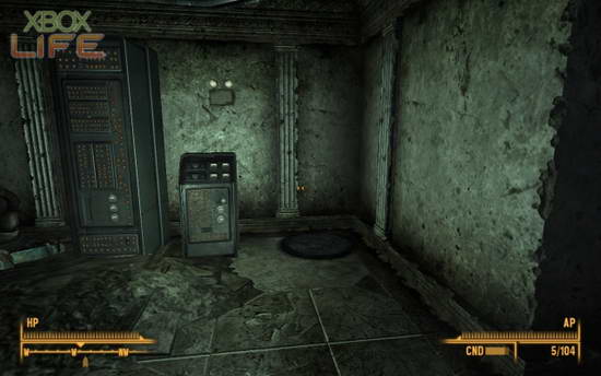 解决了这个威胁后,我跳下,就到水槽区的走道上。接著,我小心翼翼地往圆形大厅前进。途中遭遇了几个Enclave士兵,都被我一一料理掉。从他们身上搜刮出不少能量武器,而动力装甲实在太重了,只好割捨留在原地。