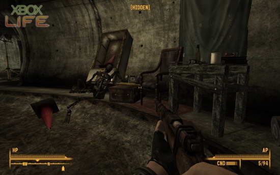 隧道中充满了Enclave大眼球,狂暴食尸鬼,辐射废料桶,还有一摊摊在地上的未知绿色液体。Enclave大眼球,基本上并不具敌意,它们只是在通道中巡视,看到我也没什么反应,也没有叫人来扁我,基本上可以不用理会。而狂暴食尸鬼在我的「偷偷摸摸」的淫威之下,还没有一个能摸得到我的,通通命丧我的猎枪之下。辐射废料桶跟绿色液体是必须远离的,它们充满了放射线,有些量级非常大,待太久是会致命的。