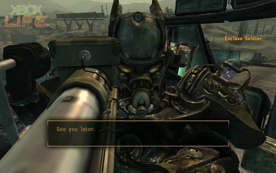 “我们兄弟会很久以前就跟Enclave交手过了。三十多年前,在西岸。根据我们的历史记载是这样的。”从历史纪录上来看,他们的士兵穿的是高级动力装甲II代,非常…坚固。比我们的动力装甲还强。他们还有更神奇的科技!垂直起降直升机!能把人打成烂泥的电浆武器!这些…有用吗?”