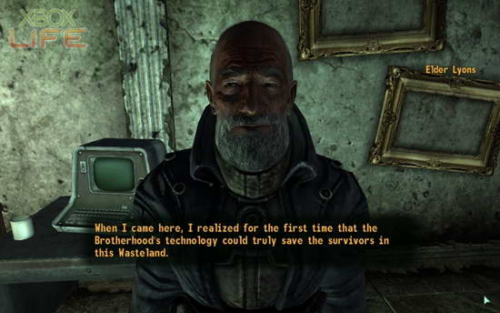 “这的确是个问题,对吧。我们接收的命令是,要取回任何先进的技术。我们尽最大的努力办到了。但是当我了解到变种人的严重威胁,我觉得我有责任,去帮助人们对抗他们。不幸的是,西岸的上层不同意我的判断,他们认为我太贴近这些人民了。他们是对的。然而,Enclave的到来改变了一切…”
