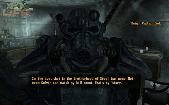 “我的「故事」?我负责爆掉两百公尺外任何生物的头。我是兄弟会最优秀的射手了。Colvin也不能跟我比。那就是我的「故事」。”