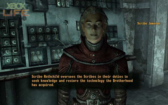 “Elder Lyons领导我们。Star Paladin Cross是总管。Sentinel Lyons,她是Elder Lyons的女儿,她指挥我们的菁英小对—Lyons’ Pride。Paladin领导Knight;Knight是兄弟会的中坚—他们穿梭于废境之中,扫除恶党,寻回科技。书记长Rothchild管理整个书记团,他们寻找失去的知识,并复原寻获的技术。”