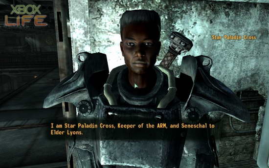 “你好。欢迎你来到Citadel。我是Star Paladin Cross,ARM监督长,以及Elder Lyons的直属总管。我很荣幸地与你的父亲非常熟。我也知道你。很久以前,我参与了淨水设施的防卫,对抗那些变种人大军。你爸离开时,我护送你们两个前往百万镇(Megaton)。我只希望我也能死得如此具有意义。”