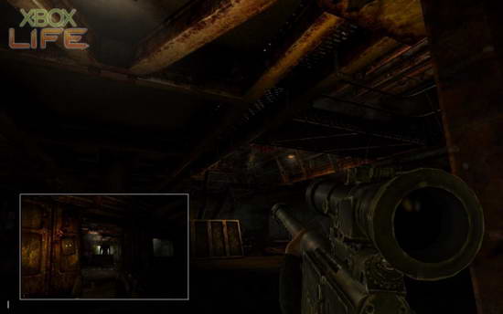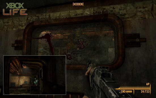 通道持续向西,在南方有条死路,内有强烈辐射污染。我避开这条死路,继续往西,然后转北。右方玻璃窗内的房间,我发现一名变种人。但他竟然对我视而不见?我潜身往北,缓缓转向房间门口移动,往房间内狙击了该名变种人。