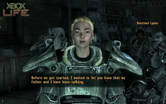 “在我们开始之前,我要让你知道我跟我父亲一直在讨论的事情。Pride和我已经决定,在经历这么多事之后,你已经是Pride的荣誉成员了。恭喜你!成员代表某些特殊权限,包含了我们的动力装甲。你要全套装甲,还是侦蒐装甲(Recon Armor)?”