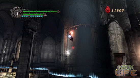 折磨大厅有一场战斗,打完之后往前上楼,到要靠魔法挂勾前进的部分。这里需要注意,有些魔法挂勾会消失,有些魔法挂勾会移动,要特别注意时机的问题。挂勾上方有铁锥,没拉好挂勾撞到铁锥,会掉到一楼,这样又会开始一场战斗,要特别小心。顺利突破这里之后,就会进入巨厅的二楼。