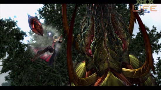 在丛林遗迹里走著走著,尼禄来到了一座恶魔之门前,这时,背后突然出现一隻会飞的大蛇攻击尼禄,经过一番缠斗,当尼禄要对大蛇做致命攻击时,一颗种子飞来,将尼禄的攻势瓦解了…