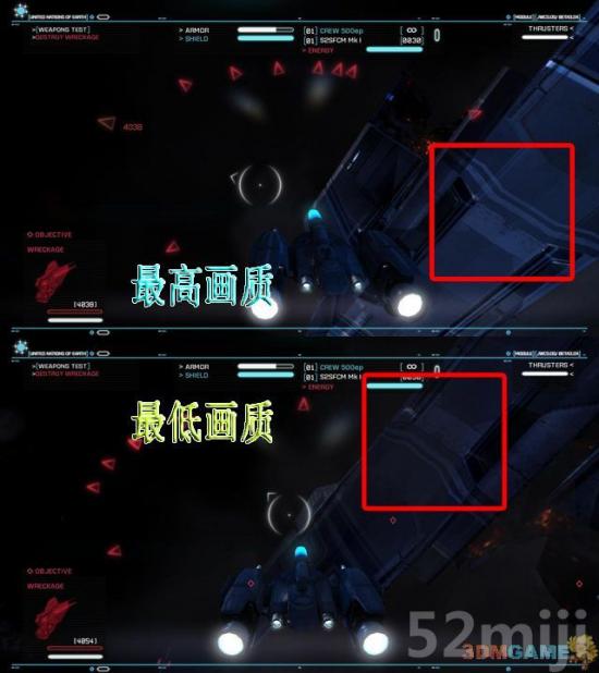 由上图可以看出,高开低开的主要区别在于模型上贴图的精细度,而且这个模拟飞行游戏最大的便宜在于只有光没有影。而且这个游戏同屏飞船数量不多,不同的飞船模型也不多,这样就极大地降低了对机器配置的考验