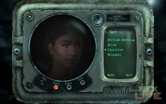 (这是调整脸部模型的时候了,还可以在这里改变性别,如果想看看男性和女性的长相再选择扮演的性别,这是个很好的时机。左边的画面是脸部的预览,在脸部预览下方有四颗按钮,分别是切换「性别」、「种族」、「脸」、「头髮」的功能按钮。在脸部预览画面可以旋转面向角度,方便观看头型的各个角度。你可以依偏好慢慢调整。Vault科技并不赶时间!)