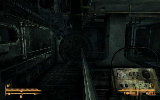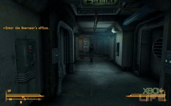 Amata叫我快点离开,她会在出口追上我的。我在房间内找到了Overseer的钥匙,用它打开了外面的门后,进了Overseer的主控室,主控室的柜子内有电脑终端机密码,我用这个密码启动了终端机,里面有不少资料。我把他们快速浏览过一遍。原来Overseer曾经派人到外面的世界探查过,其中几份是关于外面世界的报告。有个城,似乎叫做Megaton,在几份报告内都提到过。这些资料显然很重要,我把他们输入到我的Pip-Boy内。我操作终端机,要打开了秘密通道,接著Overseer的主控台开启了,那是一个往下的通道。我往下走,穿过了几道门,来到一扇超厚齿轮型钢板闸门前,在旁边有个控制台,我按下了上面的开关,开门程序启动了!但它也导致警铃大作。