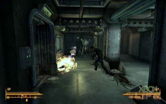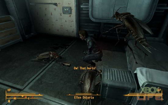 我迫不得已,开枪射杀了那些警卫,然后小心翼翼地继续走上楼去。一群群的蟑螂涌了下来,我尽可能在远距离射杀掉它们。天知道被这些蟑螂咬到会发生什么事!然而,阶梯上,迴廊上,到处都是蟑螂的尸体,有个警卫跟这些蟑螂尸体死在一起,他似乎是跟这些蟑螂的搏斗中死亡的。从前的Vault从未出现过这样的景象。我总以为这儿很安全的,怎么一觉醒来,整个世界都变了?!