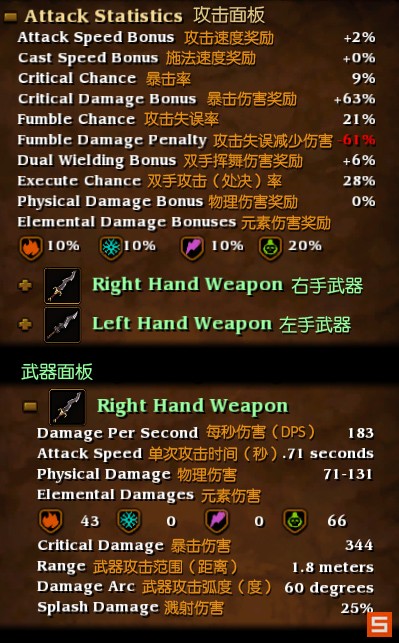 双手攻击(处决):在双手同时装备了同一大类的武器时,一定几率会触发同时用两把武器攻击的特技,伤害应该高于2个伤害的直接相加(目测的,未必准)。当使用双法杖的时候,处决时会造成小的爆炸范围打击,不同元素,视觉效果不同,但是范围都一样。
