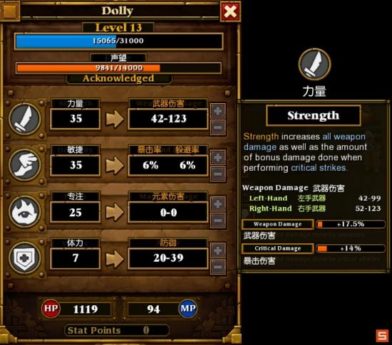 力量(strength):按比例提高所有类型武器的伤害,并按比例提高暴击伤害。