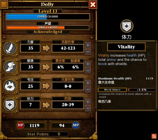 体力(vitality):提高生命上限,按比例提高防御值,提高格挡的几率。