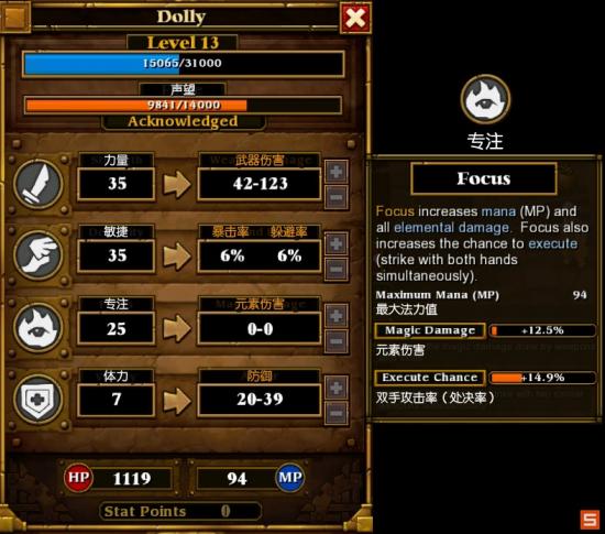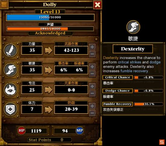 敏捷(dexterity):按比例提高发动暴击的几率,提高躲避的几率,减少失误攻击比例。