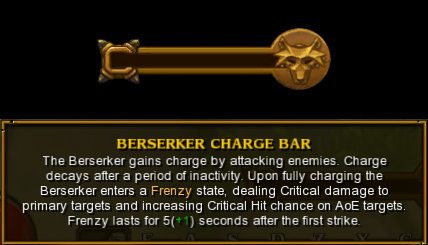 狂战士聚气条:攻击敌人会获得聚气;聚气满后进入狂暴状态,会在自开启状态后第一次攻击的5秒内,每一击普通攻击必定造成暴击(暴击伤害也有增加);范围技能增加暴击率;增加移动速度,增加攻击速度。状态过后,聚气条瞬间清零。