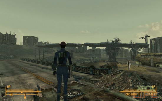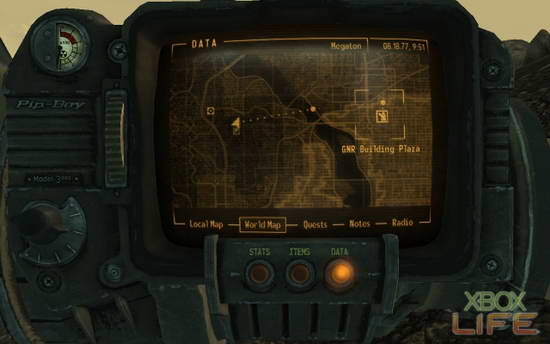 Moriarty知道我得赶快追上老爸的脚步,他帮我在Pip-Boy上标好路线(!),坚定地目送我离去。东南方,「旧特区废墟」中的「Galaxy News Radio」,那是我的下一站。