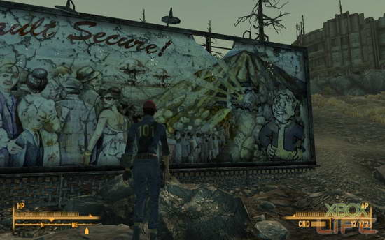 炸弹就在Megaton正中心,洼地的底端,周围还积了不少水。我想到门外有个病倒的流浪汉,但它应该不会想使用这样的水吧。当我靠近那些积水时,Pip-Boy发出警告,原来在炸弹附近的这些积水已经被污染了,是辐射水!看来这炸弹恐怕就是辐射污染的来源…