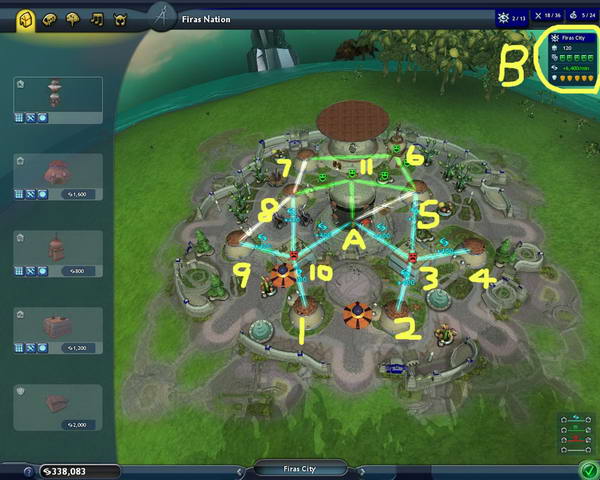 工厂和游乐园都是功能性建筑,必须与住宅搭配建造才能发挥作用,而住宅除了使前两者能发挥作用外另外一个重要功能就是增加你的车辆、飞机、船只的数量上限。右上角B图表显示的是你的城市的当前状态:眼睛表示这是个宗教城市,人形图标表示该城人口120,脸形图标全部为绿色表明该城居民目前生活得非常愉快城市生产效率达到了最高水准,如果出现红色则说明居民们生活不愉快,如果全部为红色,该城就非常容易被购买或者占领,所以一定要让居民们愉快。使它们愉快的手段就是建娱乐场,而若想让城市有收益则必须建工厂,而要让娱乐场和工厂起作用我们就一定要建住宅。绿色数字表示当前城市的收入状态,黄色盾牌表示城市的防御级别。图中所有白、绿、蓝线条间的每一个节点都是一个建造区,城市规划的挑战就在于如何利用这些节点尽可能少建娱乐场和工厂尽可能多建住宅。