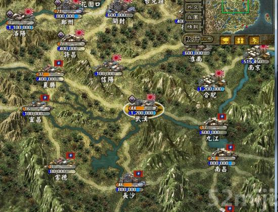 武汉有3W~5W的兵力,可以考虑开局就消灭掉。因其下面的长沙(就是开局地图中央)就有50个旅的人,旁边的城兵也多,运过来,换下装,照上面说的,第二回合就能凑齐2战车+2大炮+4步兵共8W+的兵力,拿下武汉完全不是问题,不过你打的时候可能旁边的电脑正在运兵过来,侦查到是3W兵力,打的时候变成5W兵力,这将是一场硬仗。