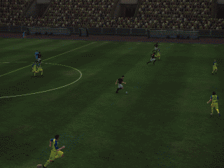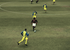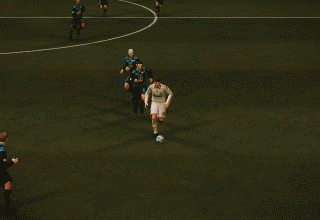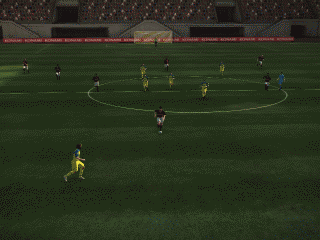 但大部分情况下,对方的后卫线是不会直接把空挡对准你的前锋的。如果前锋的正前方有后卫防守,那就不能直线突破了。在一开始持续向前加速跑的过程中,就要估算好和正前方后卫的距离,依距离的远近,分别考虑加速向侧面跑一步,或者是不加速向侧面跑一步,这两种选择。(两种选择如下图)目的只有一个——让前锋身前不要对着后卫。之后按假射,再直线向前突破即可。